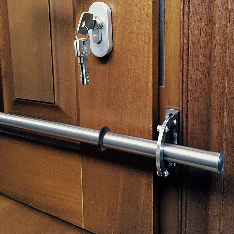 Οι ρυθμιζόμενες βάσεις τοποθετούνται είτε στον τοίχο είτε στο μεταλλικό κάσωμα στην περίπτωση θωρακισμένης πόρτας. Δεν χρειάζονται προσθήκες ή τακάκια για τη σωστή τοποθέτηση. Αφού γίνει η ανάλογη ρύθμιση όπως υποδεικνύουν οι οδηγίες, τοποθετείται ο ανοξείδωτος σωλήνας που ασφαλίζει την πόρτα. Όταν δεν γίνεται χρήση, ο αποσπώμενος σωλήνας φυλάσσεται χωριστά.